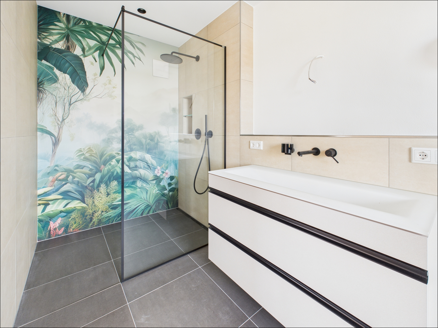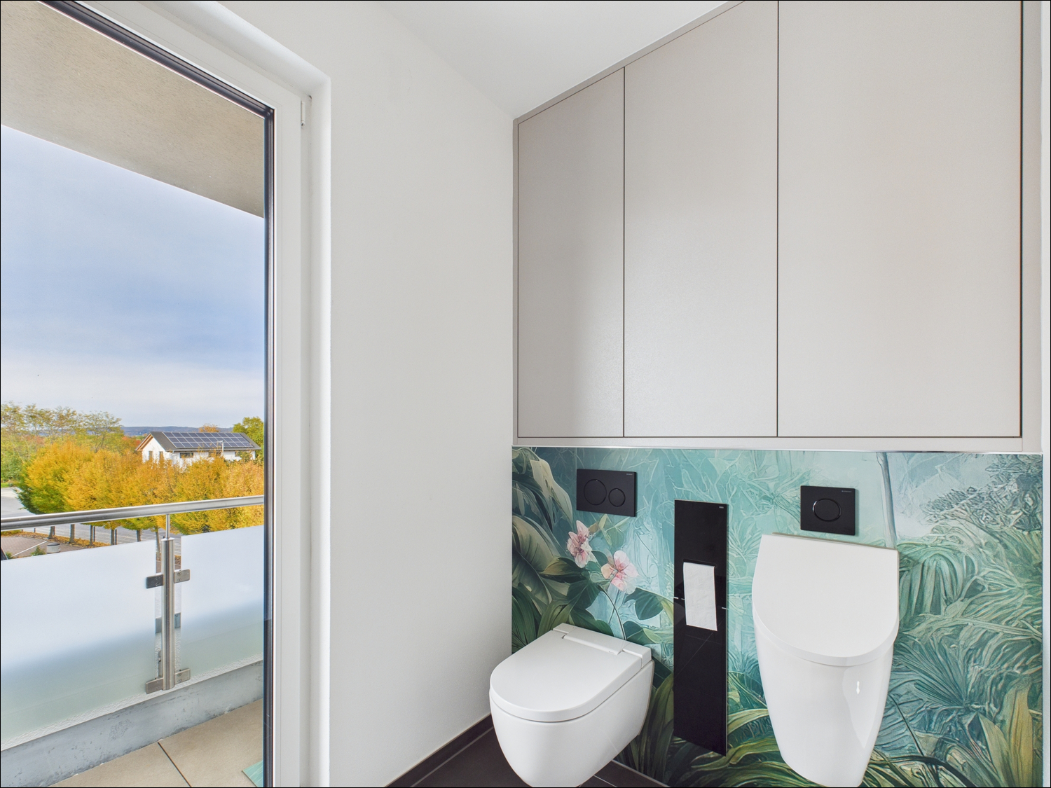 Ein weiteres Highlight ist die große umlaufende Terrasse, die von jedem Zimmer aus begehbar ist und Ihnen somit uneingeschränkten Zugang zu einem privaten Outdoor-Bereich bietet – ideal für Entspannung, gesellige Abende oder einfach einen Moment der Ruhe im Freien. Das großzügige Schlafzimmer wird durch einen hochwertigen, maßgeschneiderten Einbauschrank elegant in zwei Bereiche unterteilt und bietet somit hohe Flexibilität – ob als Rückzugsort oder Homeoffice, hier sind Ihren Ideen keine Grenzen gesetzt. Das Tageslichtbadezimmer punktet mit einer bodentiefen Dusche, modernen Armaturen und Einbauschränken. Für Ihre Gäste steht Ihnen ein separates Gäste-WC zur Verfügung.