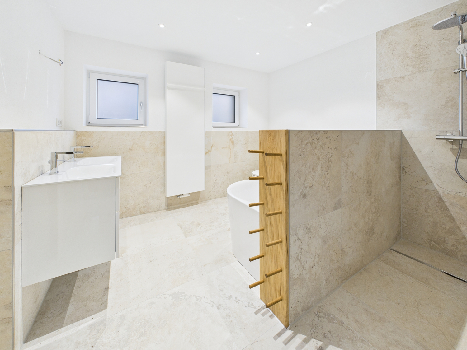 Im 1. Obergeschoss stehen Ihnen drei Schlafzimmer zur Verfügung, eines verfügt über einen Balkon mit Blick über die Terrasse und Garten . Das Badezimmer lässt keine Wünsche offen: Tageslicht durch die beiden Fenster, eine bodengleiche Dusche, und eine Badewanne zum Entspannen.