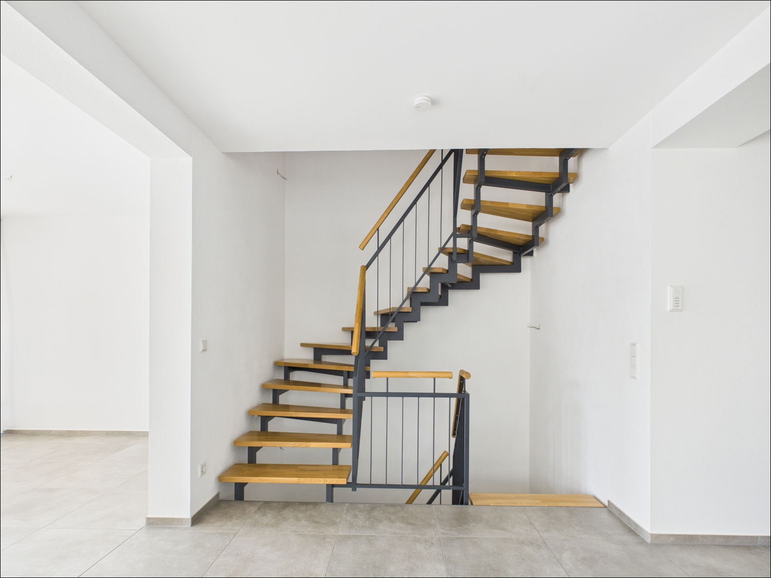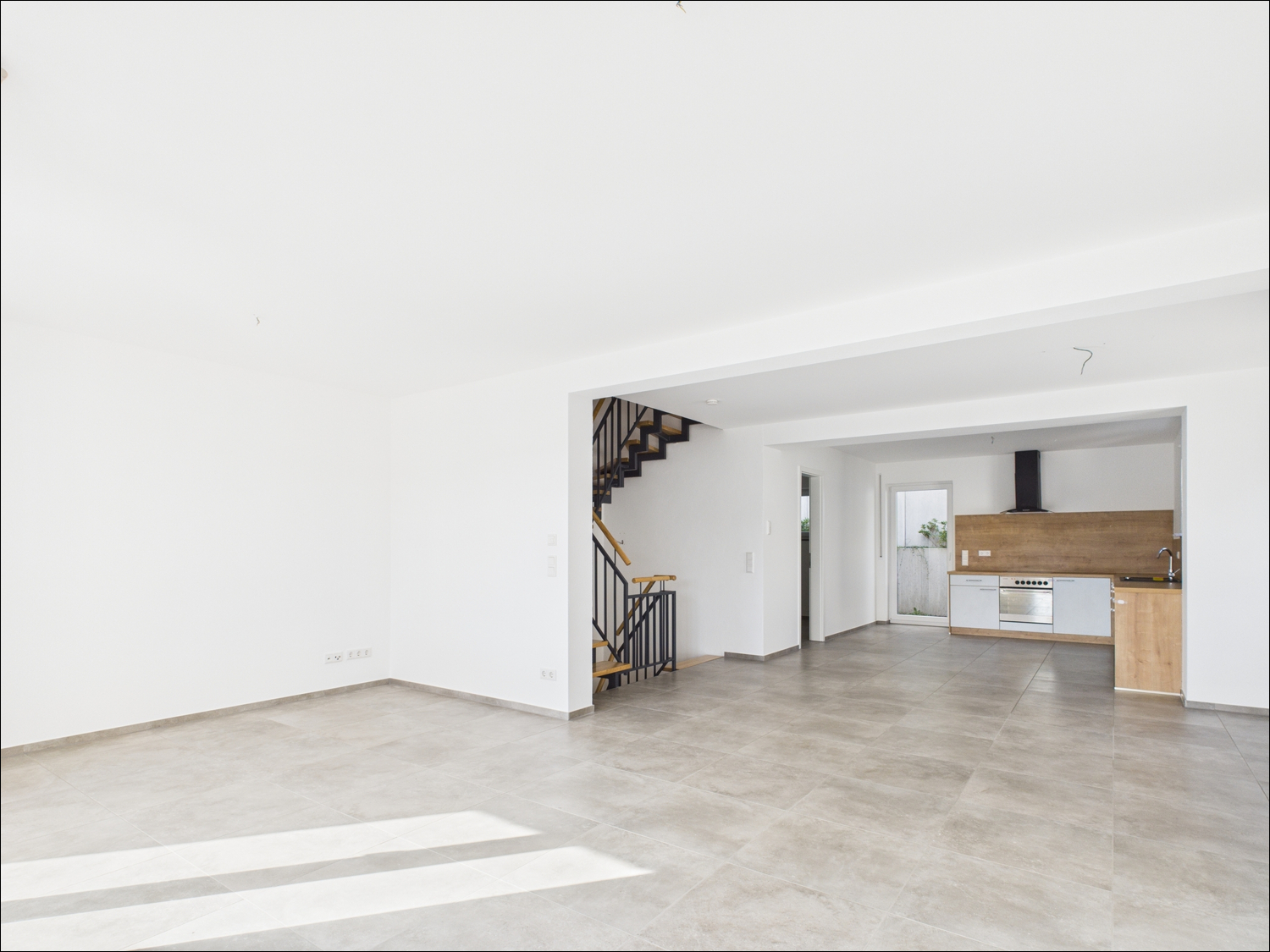 Über eine offen gestaltete Treppe gelangen Sie in das 1. Obergeschoss. Dieses Stockwerk setzt sich aus einem geräumigen, von Tageslicht durchfluteten Wohn- / Ess- / Kochbereich zusammen. Die offene Einbauküche kann gerne von den Vormietern übernommen werden. Von hier gelangen Sie auf die Süd-Ost Terrasse. Von dem Wohnzimmer haben Sie Zugang zu dem Balkon, der Ihnen einen Blick über die Terrasse ermöglicht.