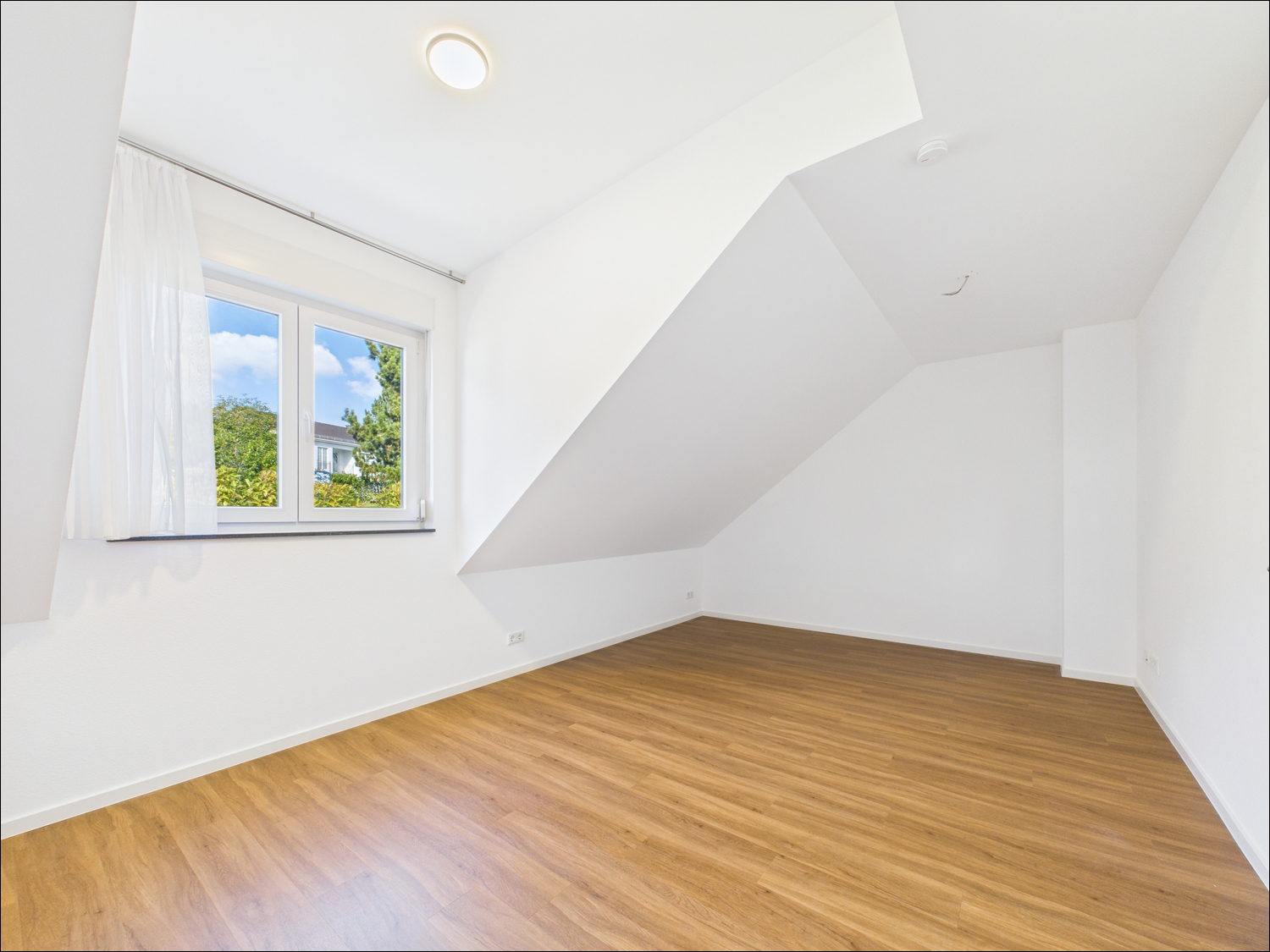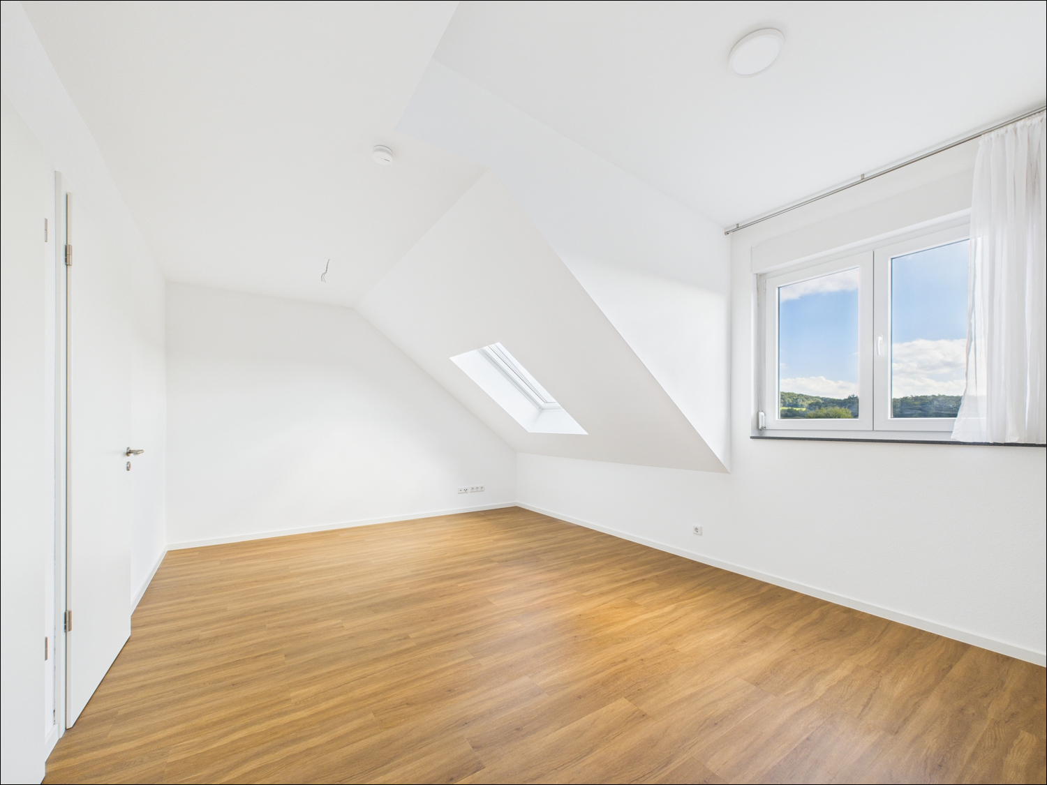 Im Dachgeschoss befindet sich ein großes Elternschlafzimmer und gegenüber ist ein weiteres Schlafzimmer platziert.
