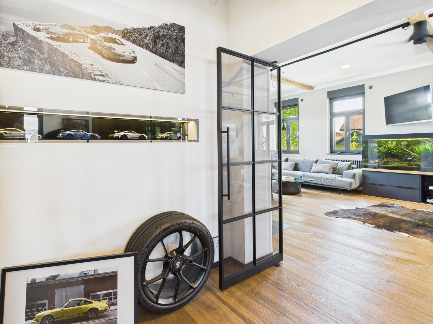 Die flexible Raumaufteilung erlaubt eine Nutzung als großzügiges Familiendomizil, als Mehrgenerationenhaus oder zur Kombination von Wohnen und Arbeiten. Das ausgebaute Dachgeschoss bietet zusätzliche Möglichkeiten, etwa für ein Studio oder Gäste, und verfügt über einen privaten Balkon sowie Anschlüsse für eine Kitchenette.